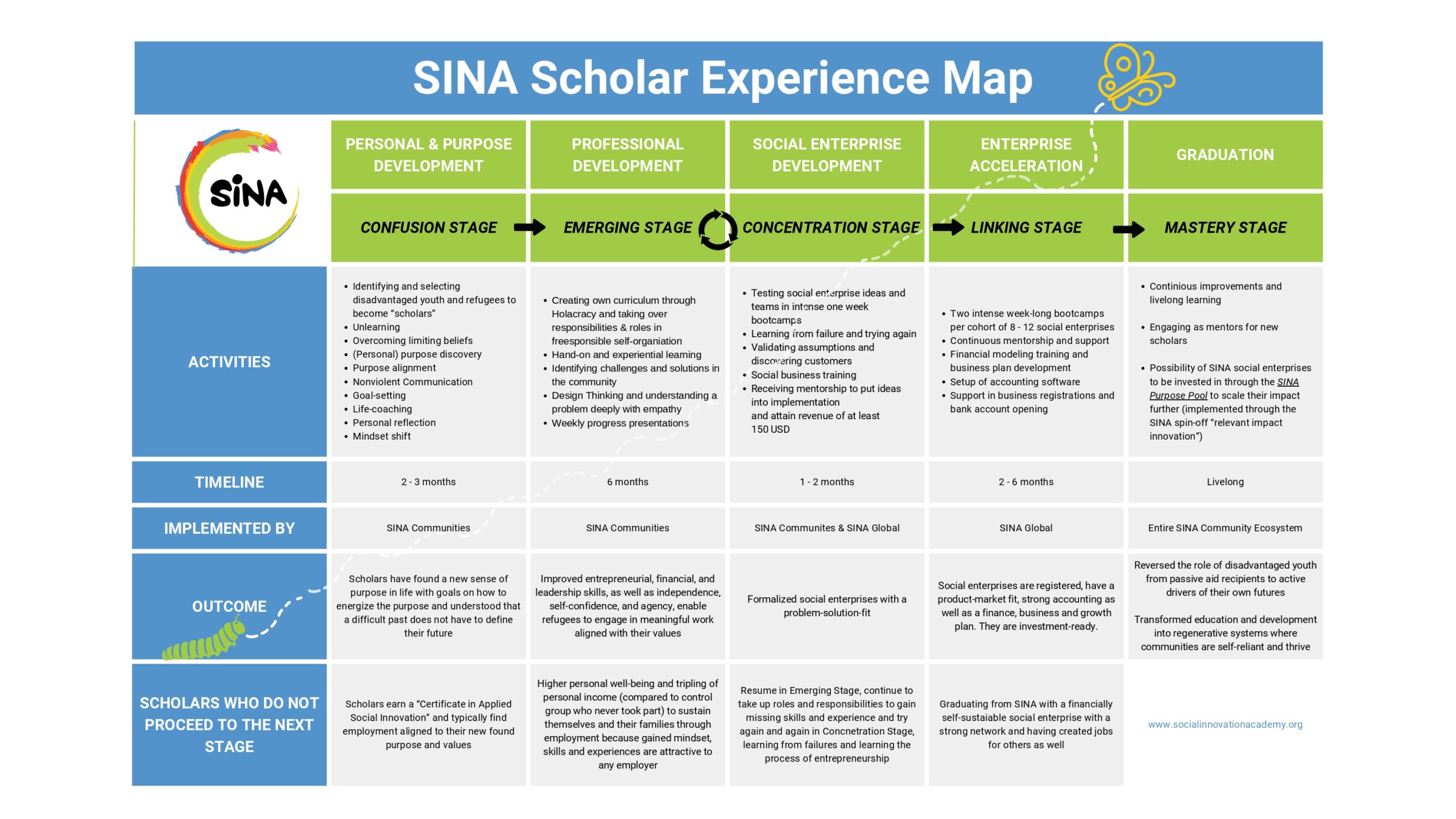 We have updated our Theory of Change (ToC) and also created a “SINA Scholar Experience Map” displaying the journey of disadvantaged youth becoming changemakers and social entrepreneurs through the SINA Framework. We wish to share both of them: